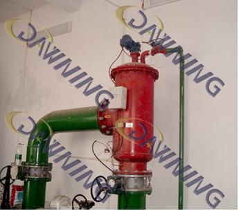 現(xiàn)場安裝圖,圖中立式自清洗過濾器室內(nèi)安裝,下進側出,右邊小管道與排污口連接方便導出排出的雜質(zhì)。